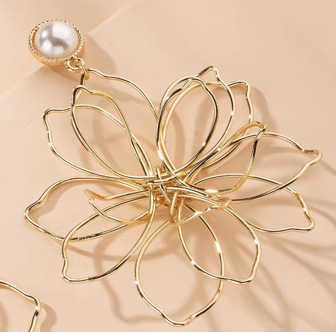 Boucles d’oreilles florales dorées, délicatement ajourées, sublimées par une perle nacrée lumineuse.